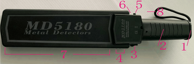 LED 灯:当打开电源开关,绿色灯亮时提示工作正常,黄色灯亮时表示,电池电量大约只有 10%。提示电池需要更换或者充电。红色灯亮时,表示探测到金属物。当探测金属物越大时,灵敏度越高,报警声音越大。当探测金属物越小时灵敏度越低,报警声音也随着逐渐降低。